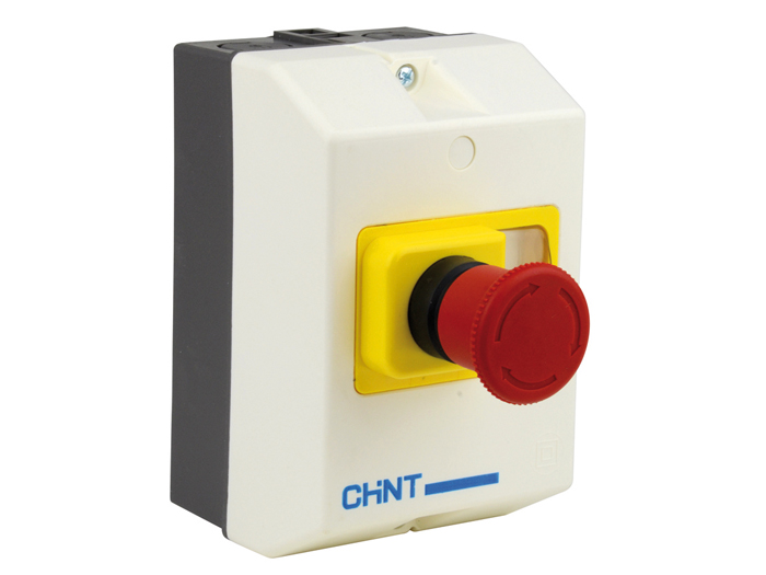 Coffret avec bouton d'arrêt coup de poing à accrochage pour disjoncteur magnéto-thermique tripolaire.